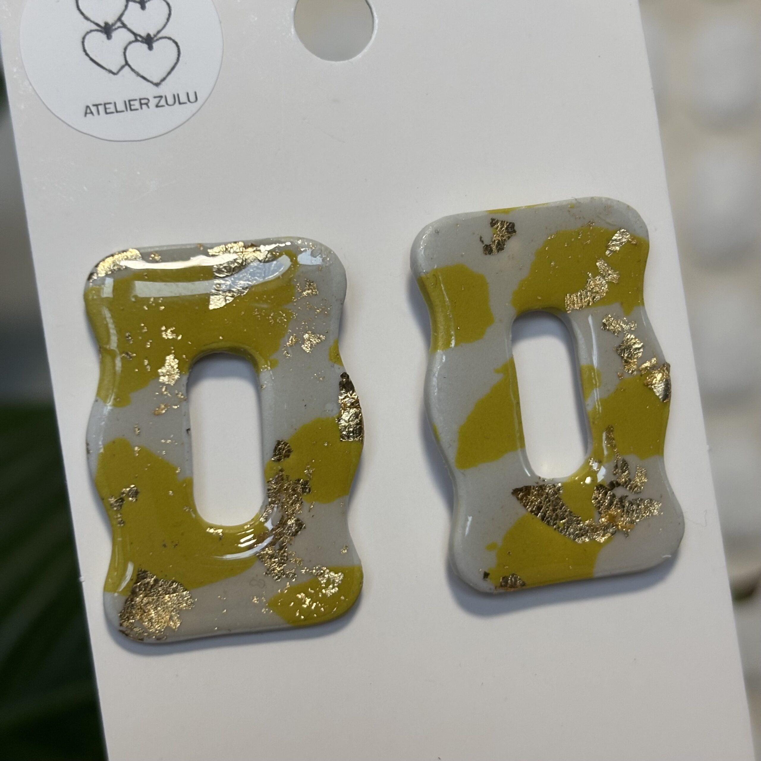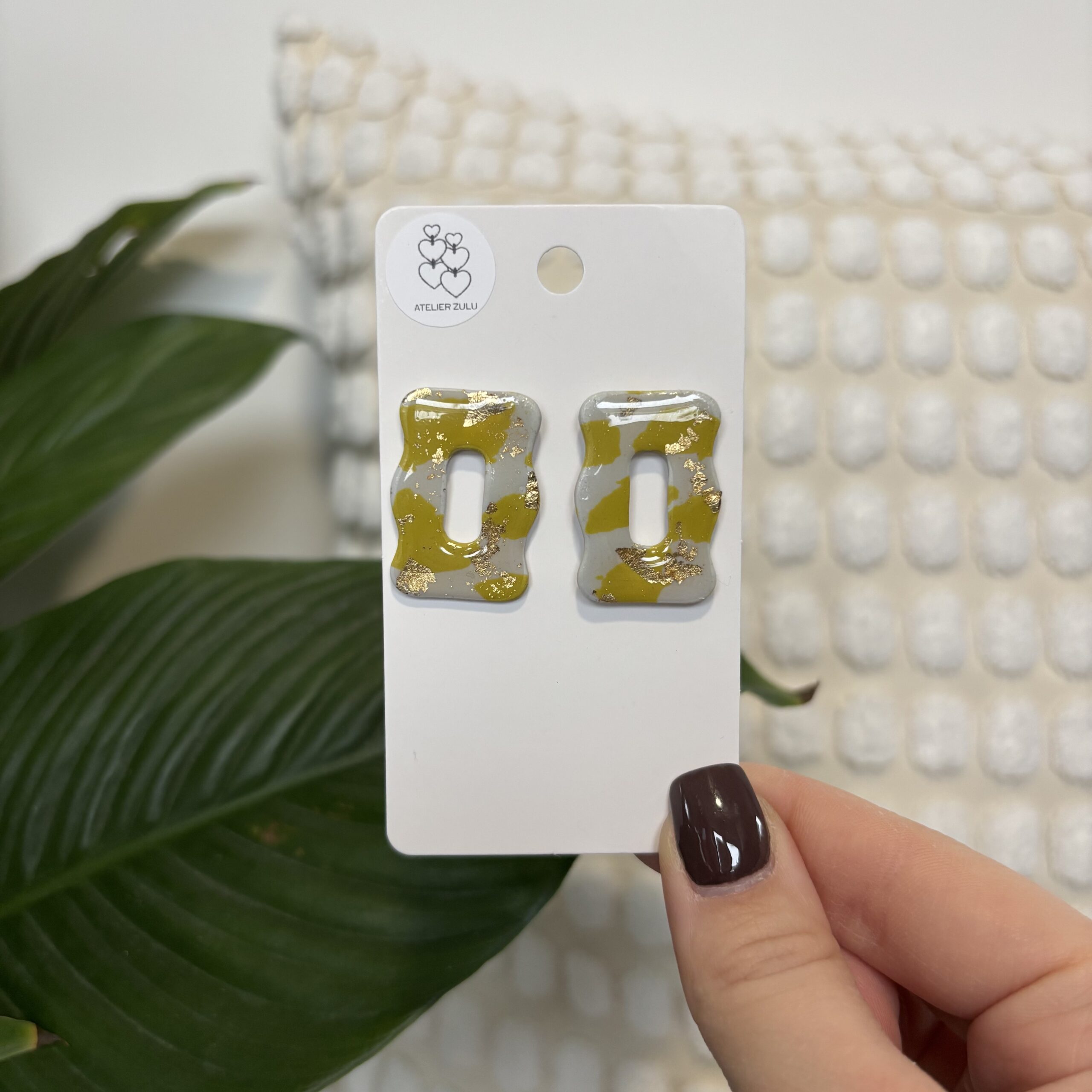 Nietuzinkowe kolczyki w kształcie pofalowanego prostokąta w kolorze zieleni i szarości ze złotymi akcentami. Dodatkowo kolczyki pokryte są warstwą żywicy, co daje piękny połysk.
