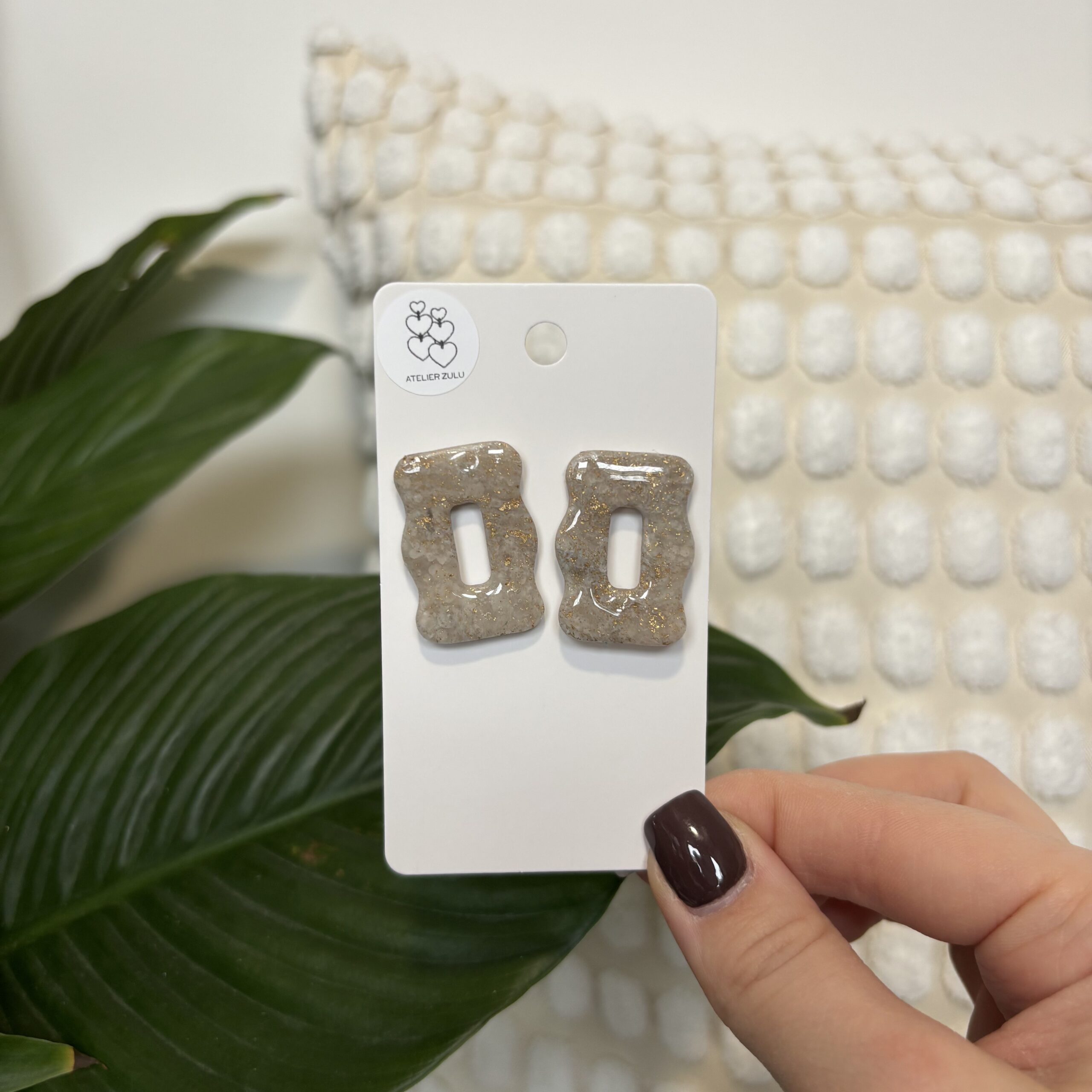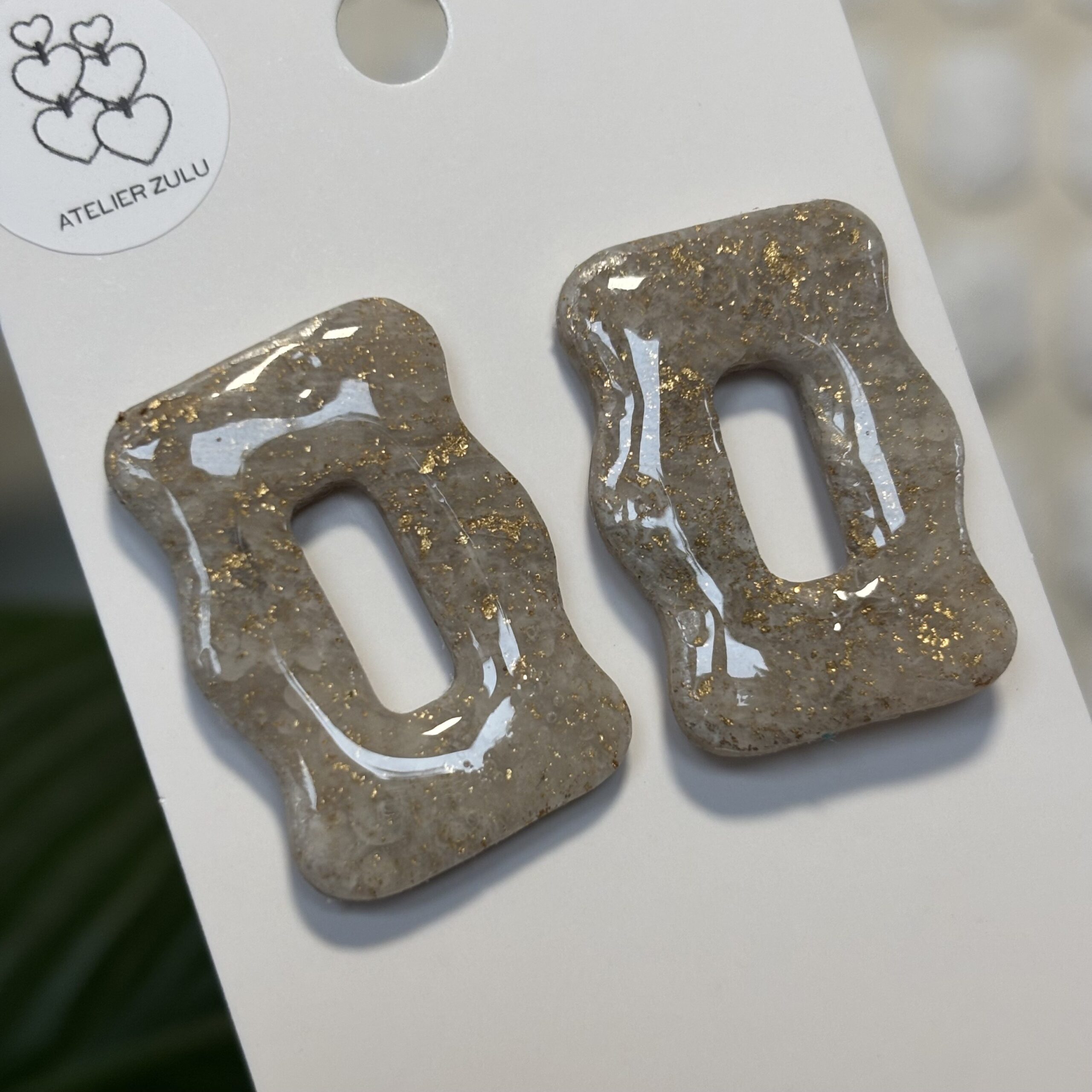 Nietuzinkowe kolczyki w kształcie pofalowanego prostokąta w kolorze beżu z subtelnym brokatowym wzorkiem. Dodatkowo kolczyki pokryte są warstwą żywicy, co daje piękny połysk.