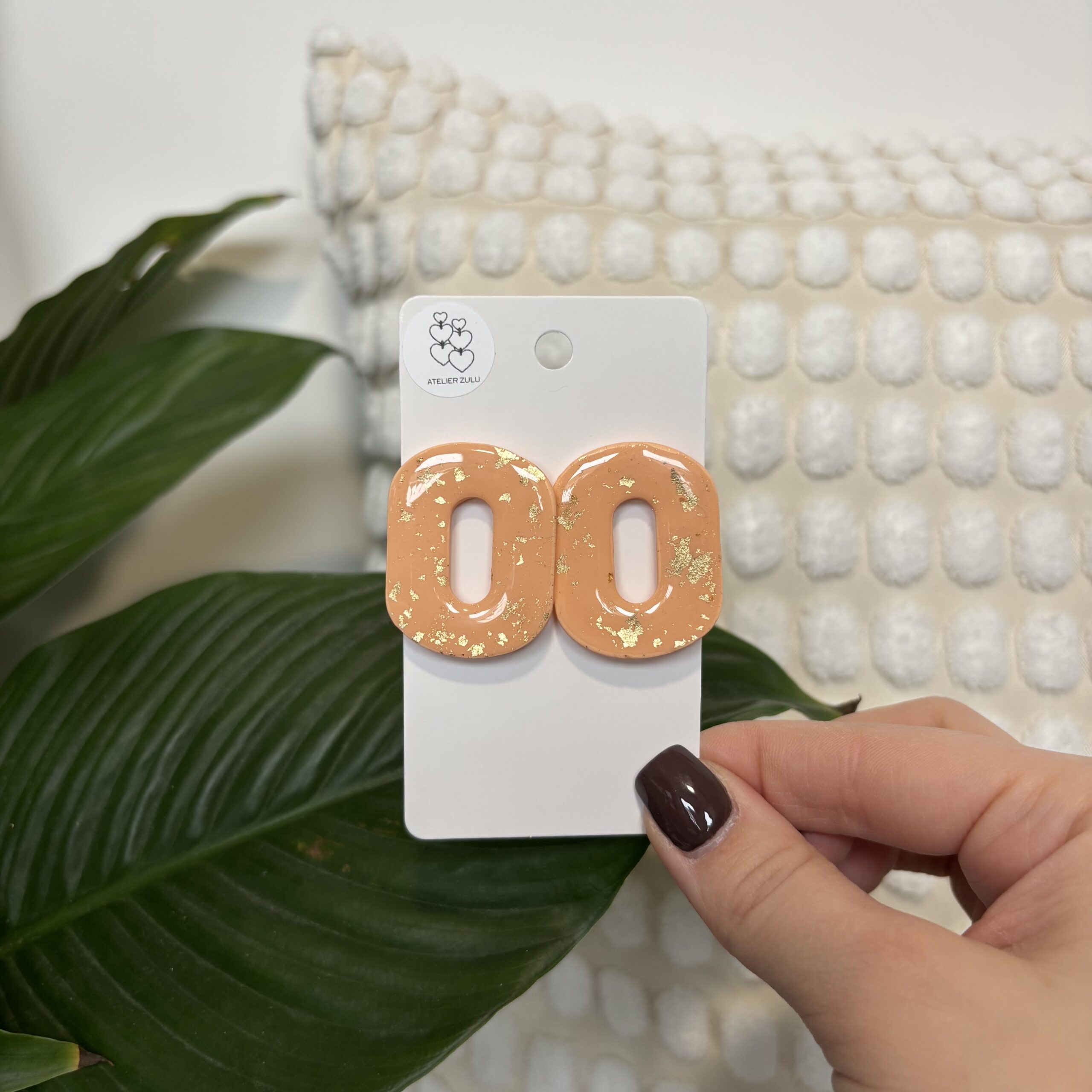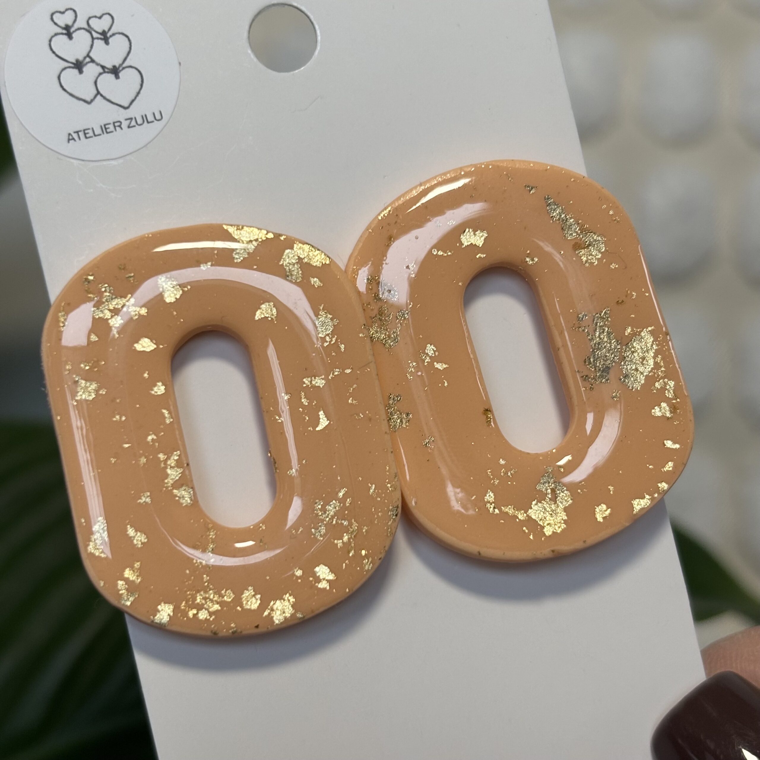 Oryginalne owalne kolczyki w kolorze pastelowego pomarańczowego ze złotymi akcentami. Dodatkowo kolczyki pokryte są warstwą żywicy, co daje piękny połysk.