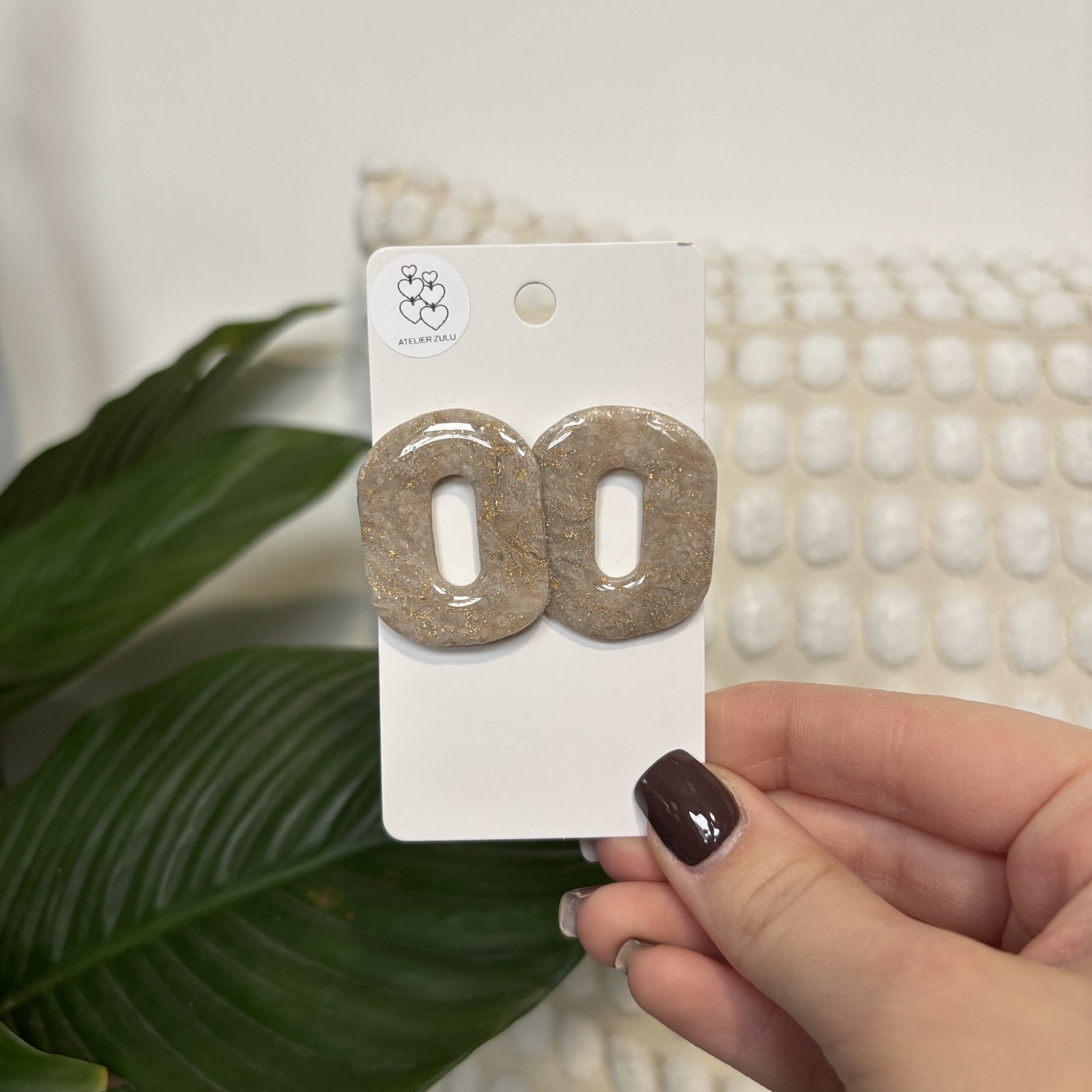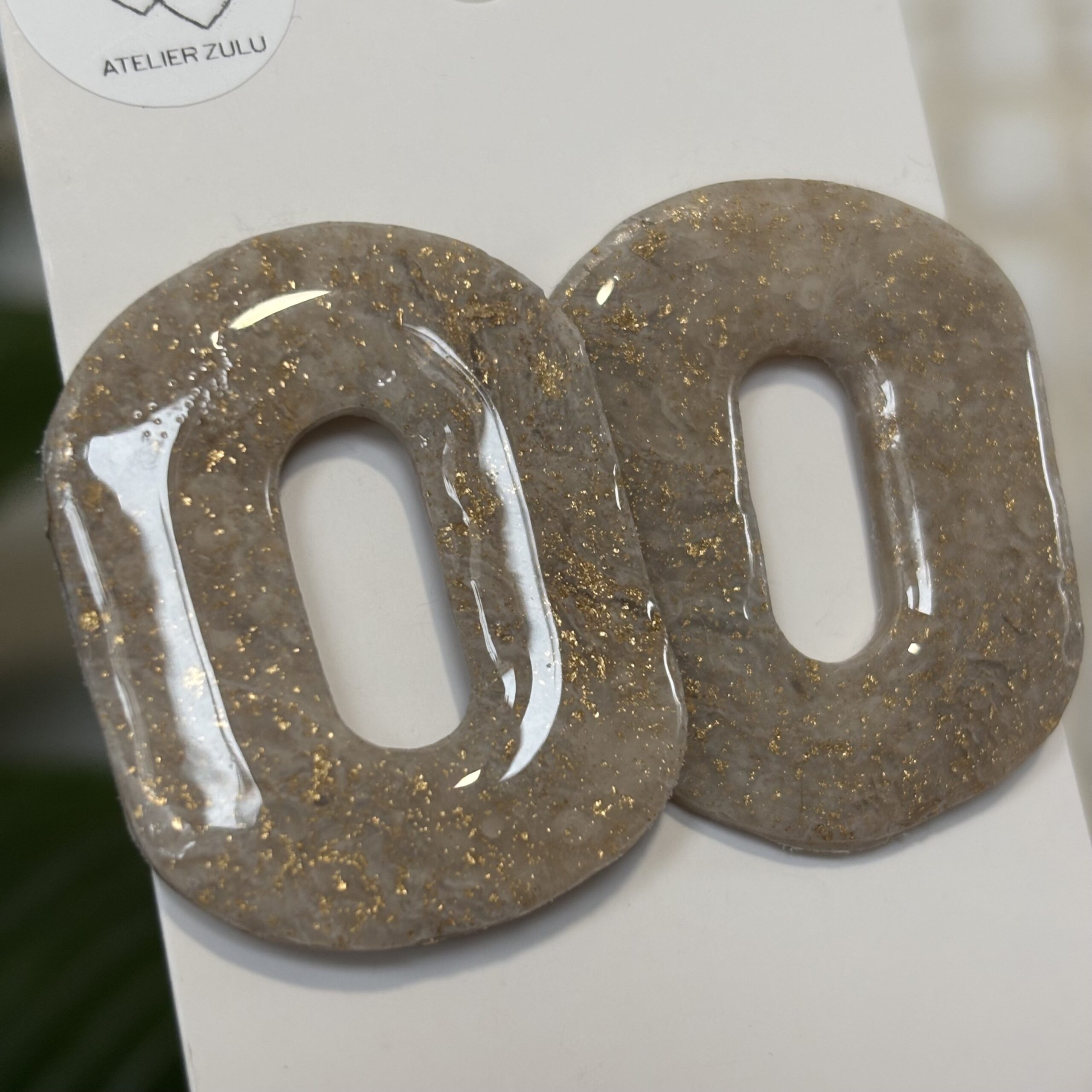 Oryginalne owalne kolczyki w kolorze beżu ze złotymi akcentami. Dodatkowo kolczyki pokryte są warstwą żywicy, co daje piękny połysk.