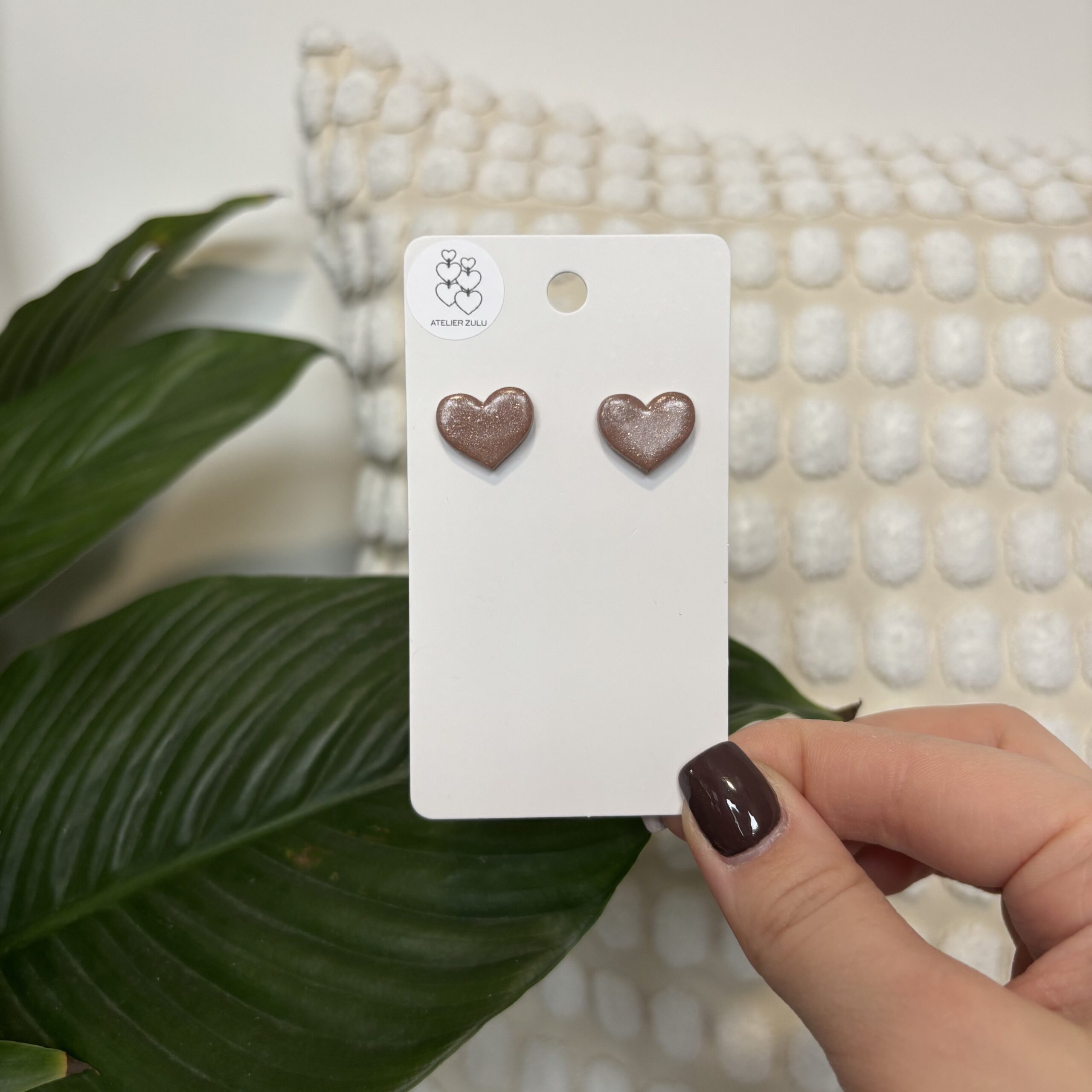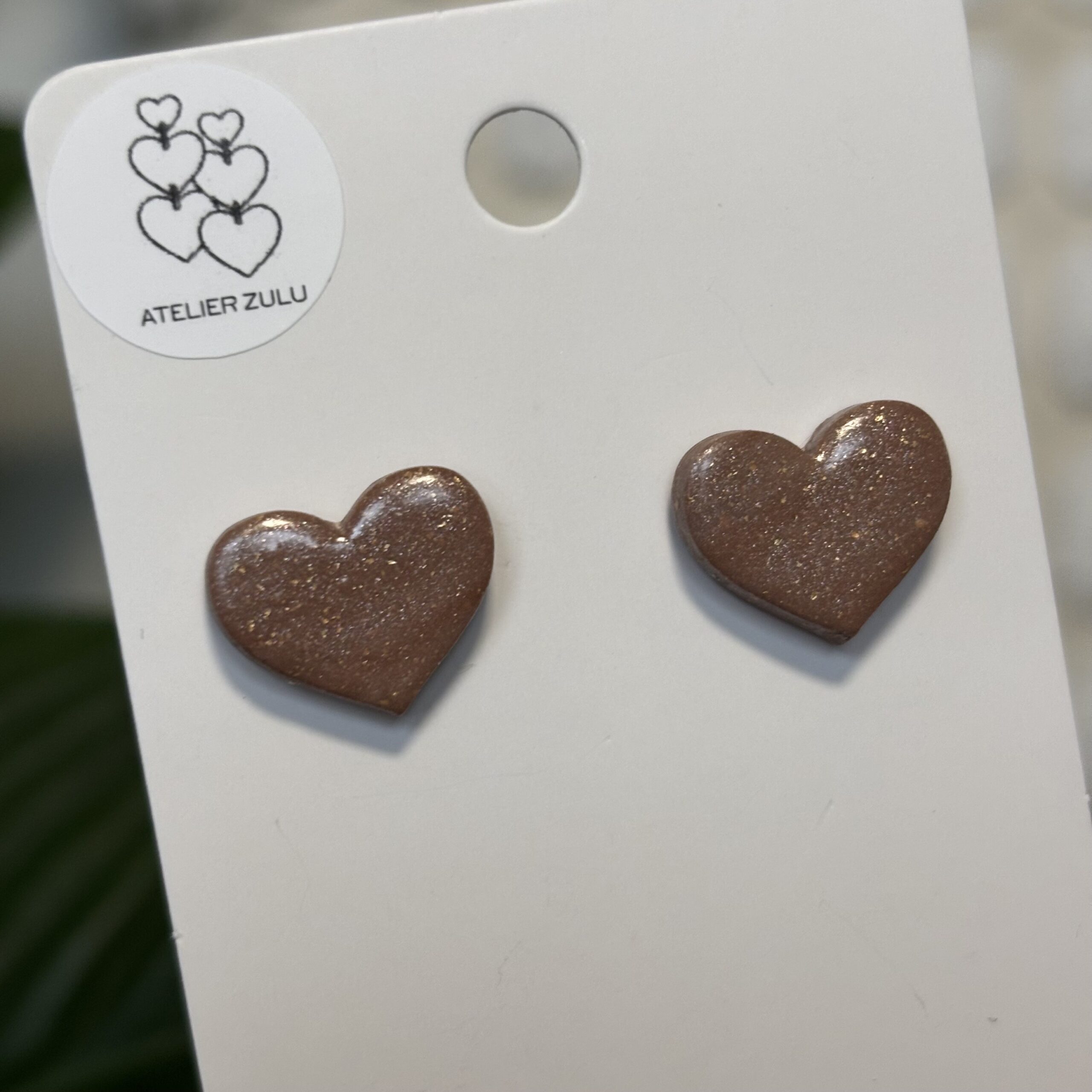 Minimalistyczne kolczyki w kształcie serca, zdobione subtelnym brokatowym wzorem. Kolorystyka łączy ciemny beż oraz złoto. Dodatkowo kolczyki pokryte są warstwą lakieru, co daje piękny połysk.